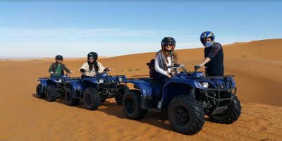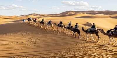 Llegaremos a la ciudad de Erfoud, conocida por sus fósiles. Pararemos para ver una de sus famosas fábricas de fósiles. A primera hora de la tarde llegaremos a las impresionantes dunas de Merzouga, desierto del Sahara, donde cambiaremos el coche por la tracción animal: Los camellos. Se adentrarán en el profundo desierto sobre estos animales.