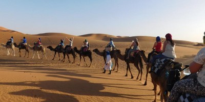 Ellos les tendrán preparado un exquisito plato de cous cous tadicional que comeremos juntos. Las mujeres de la familia les podrán hacer tatuajes de henna si lo desean. Tras todo esto, nos dirigiremos hacia los camellos. Montarán en los autóctonos animales para realizar la excursión por el desierto, mientras disfrutarán de una puesta de sol increíble. Llegarán a un campamento bereber equipado, donde les tendrán preparada una exquisita y típica cena marroquí.